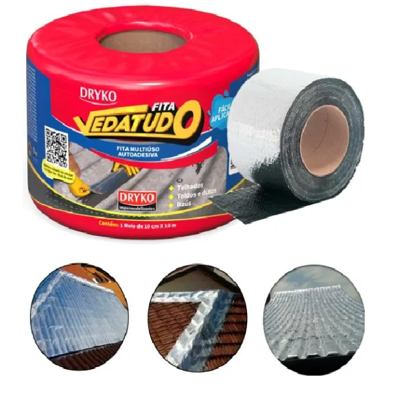 Fita autoadesiva multiuso à base de asfalto modificado, autoprotegida com filme de alumínio que permite sua exposição a intempéries e aos raios solares, sendo de fácil aplicação, na qual proporcionam medidas imediatas para solucionar problemas de gotejamento e vedações.
