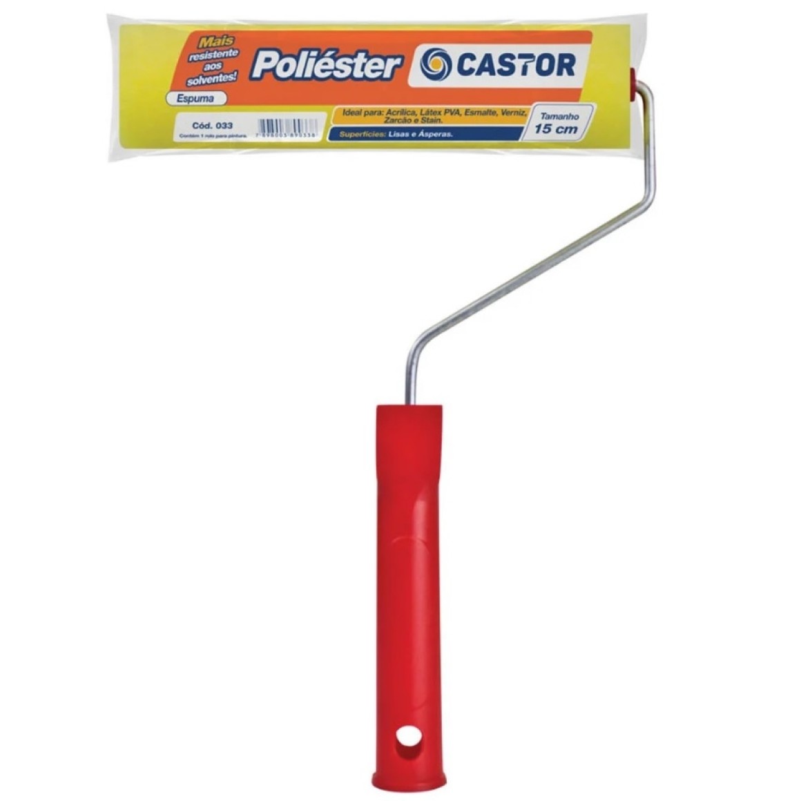Rolo de espuma poliéste resistente a solvente e alta absorção e retenção da tinta, o que faz com que o rolo mantenha sua qualidade por muito mais tempo, proporcionando um acabamento sem marcações, com aspecto muito suave e uniforme. Ideal para látex, PVA e acrílica (à base d água), esmaltes sintéticos, óleos, vernizes, zarcão.